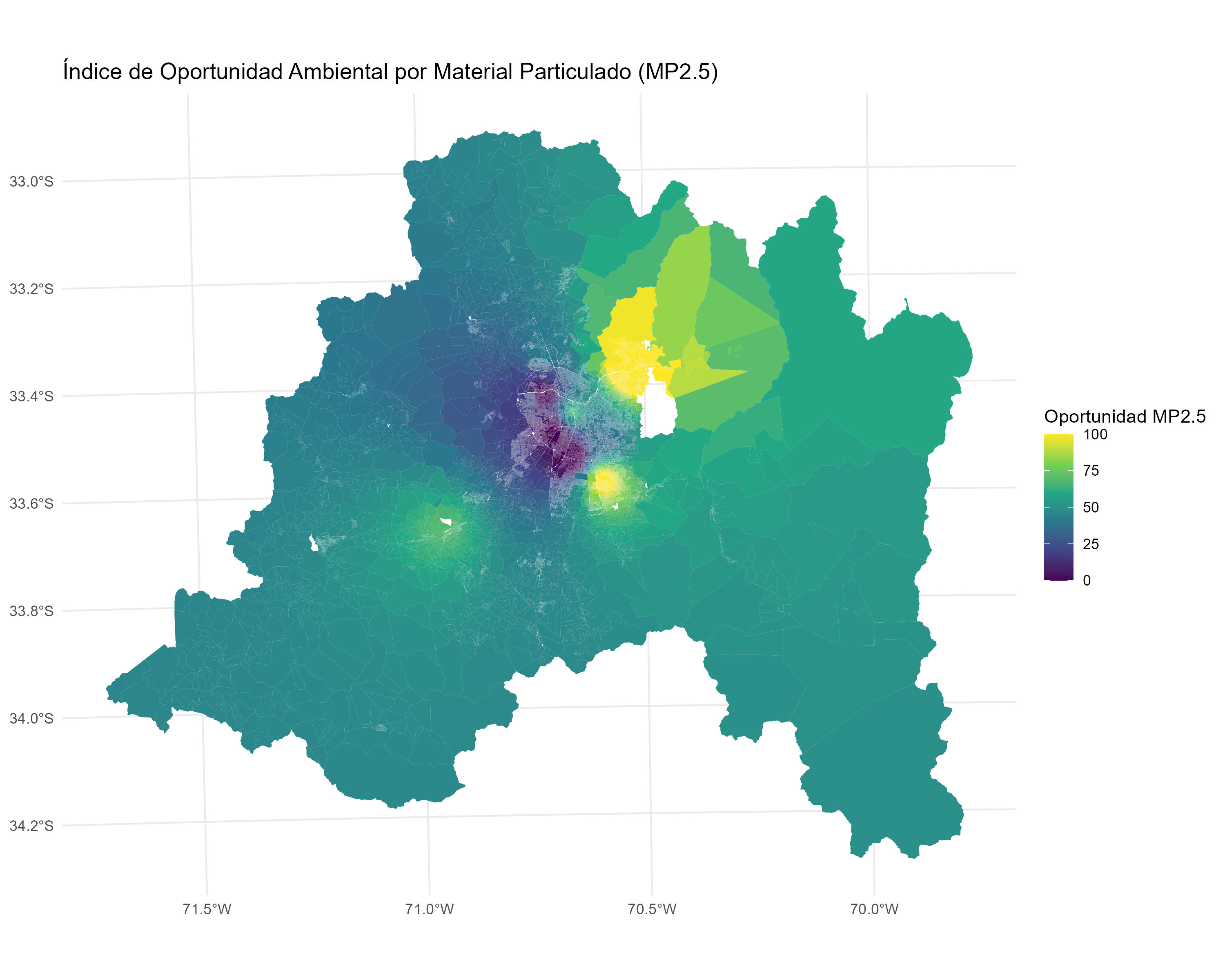 Se generó un mapa (8.1) de oportunidad ambiental por manzana censal, donde los valores más altos indican menor exposición a PM2.5.